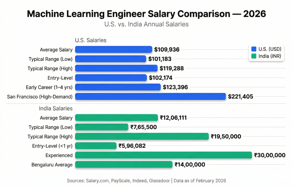- What is the average salary of a Machine Learning Engineer? Salaries vary based on experience and location. In the U.S., the average salary is approximately $109,936 per year, with a typical range between $101,183 and $119,288 (source: Salary.com). In high-demand cities like San Francisco, salaries can reach around $221,405 per year (source: Indeed). In India, the average salary is around ₹12,06,111 per year, with a range between ₹7,65,500 and ₹19,50,000 (source: Glassdoor). Experienced professionals can earn up to ₹30,00,000 per year (source: PayScale).